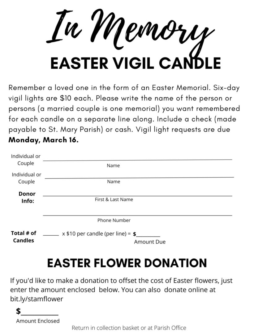Remember a loved one with an Easter Memorial at St. Mary. Six-day vigil lights are $10 each. Please complete a form located in the church entrances or (download a form here) and submit it with payment to the parish office by March 16. Candles will be displayed at St. Mary's Easter Vigil.