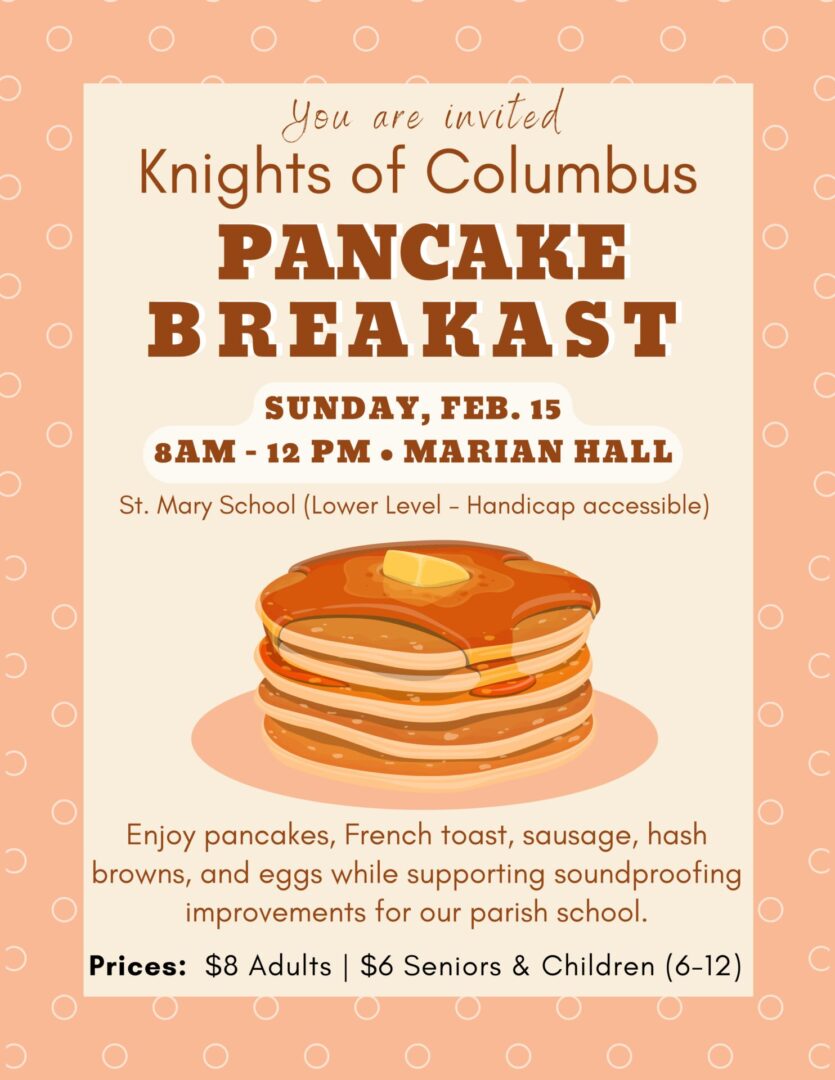 Knights of Columbus Breakfast is Feb. 15 at St. Mary By Communication Office | 02/12/2026 Posted in News ← 2026 Catholic Stewardship Appeal Kickoff Weekend!Ash Wednesday is Feb. 18 →